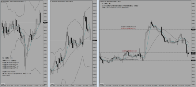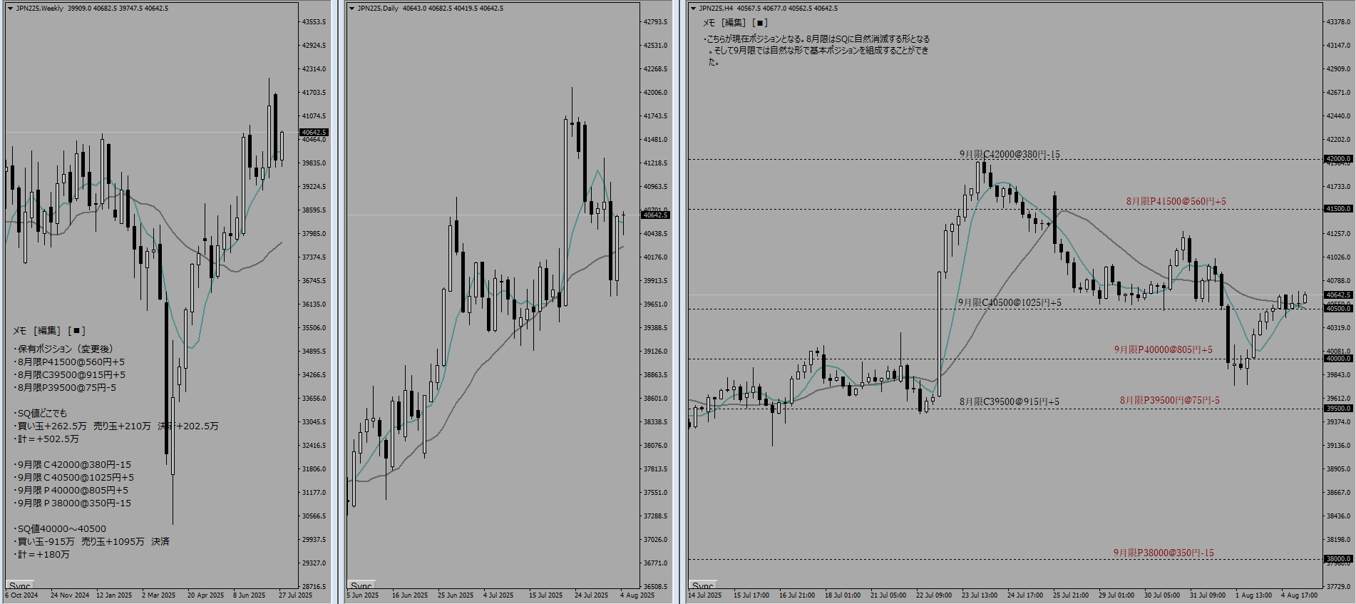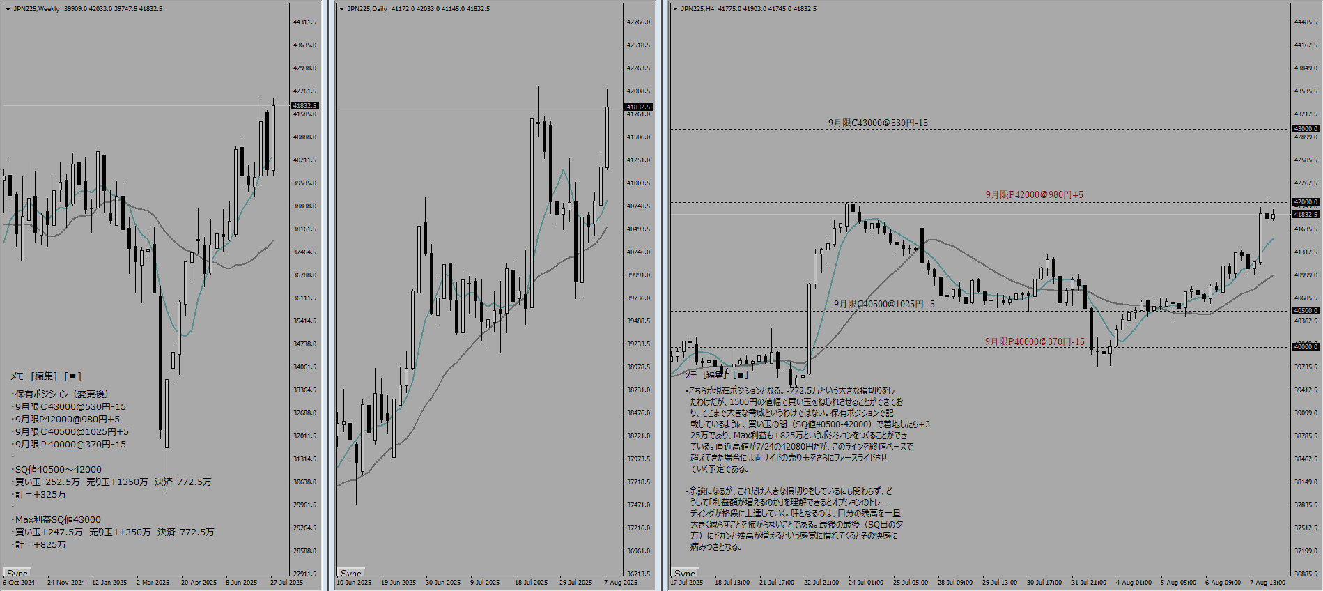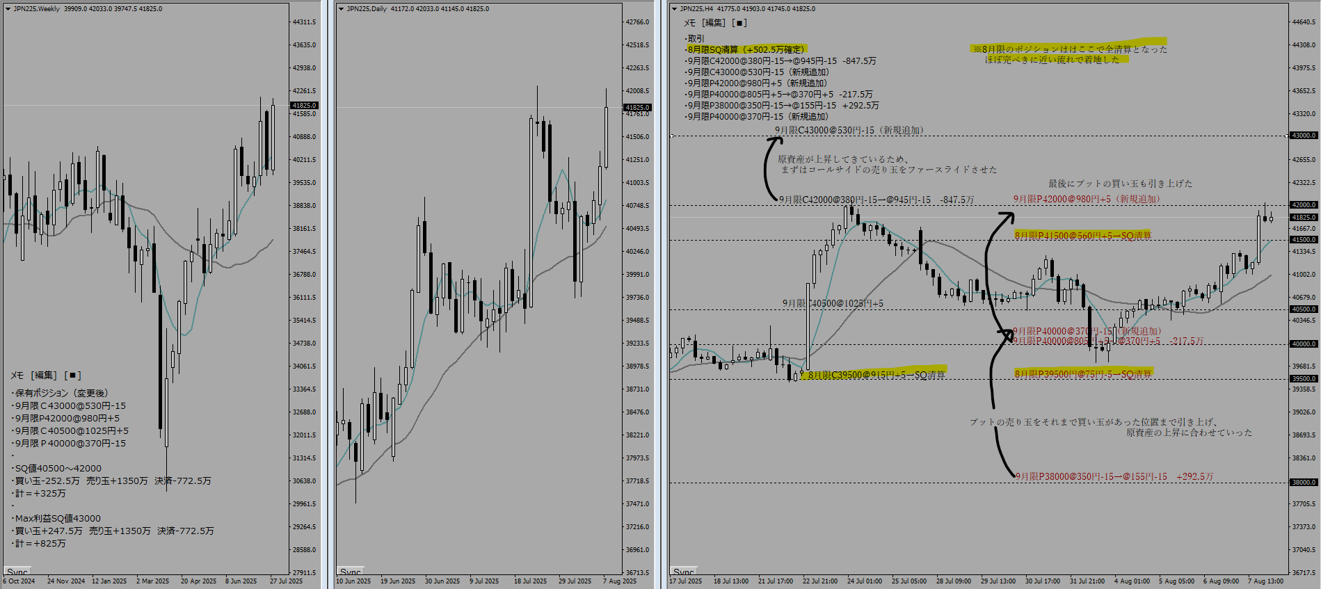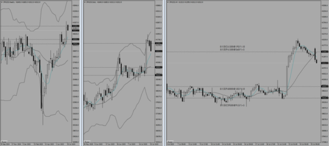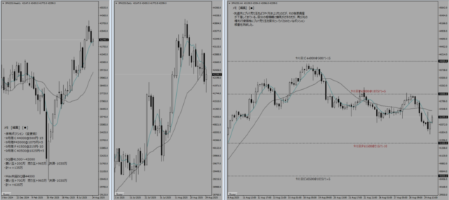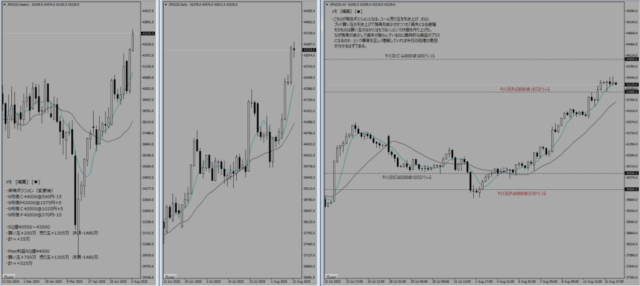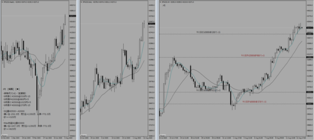 本日は8月SQであり、8月限は清算された。また、株価指数が42000円付近まで一気に上昇してきたため、9月限のポジションも移動せざるを得なくなった。-772.5万という大きな損切りをしたわけだが、1500円の値幅で買い玉をねじれさせることができており、そこまで大きな脅威というわけではない。保有ポジションで記載しているように、買い玉の間(SQ値40500-42000)で着地したら+325万であり、Max利益も+825万というポジションをつくることができている。直近高値が7/24の42080円だが、このラインを終値ベースで超えてきた場合には両サイドの売り玉をさらにファースライドさせていく予定である。