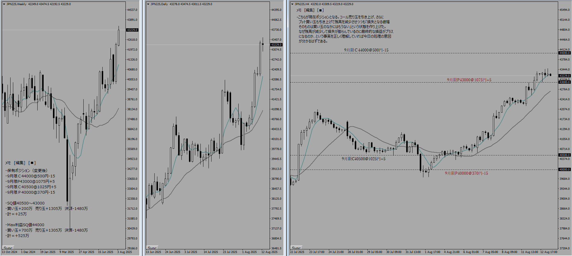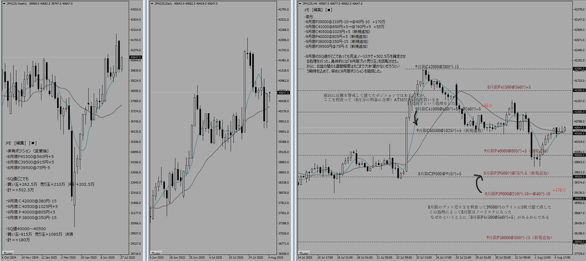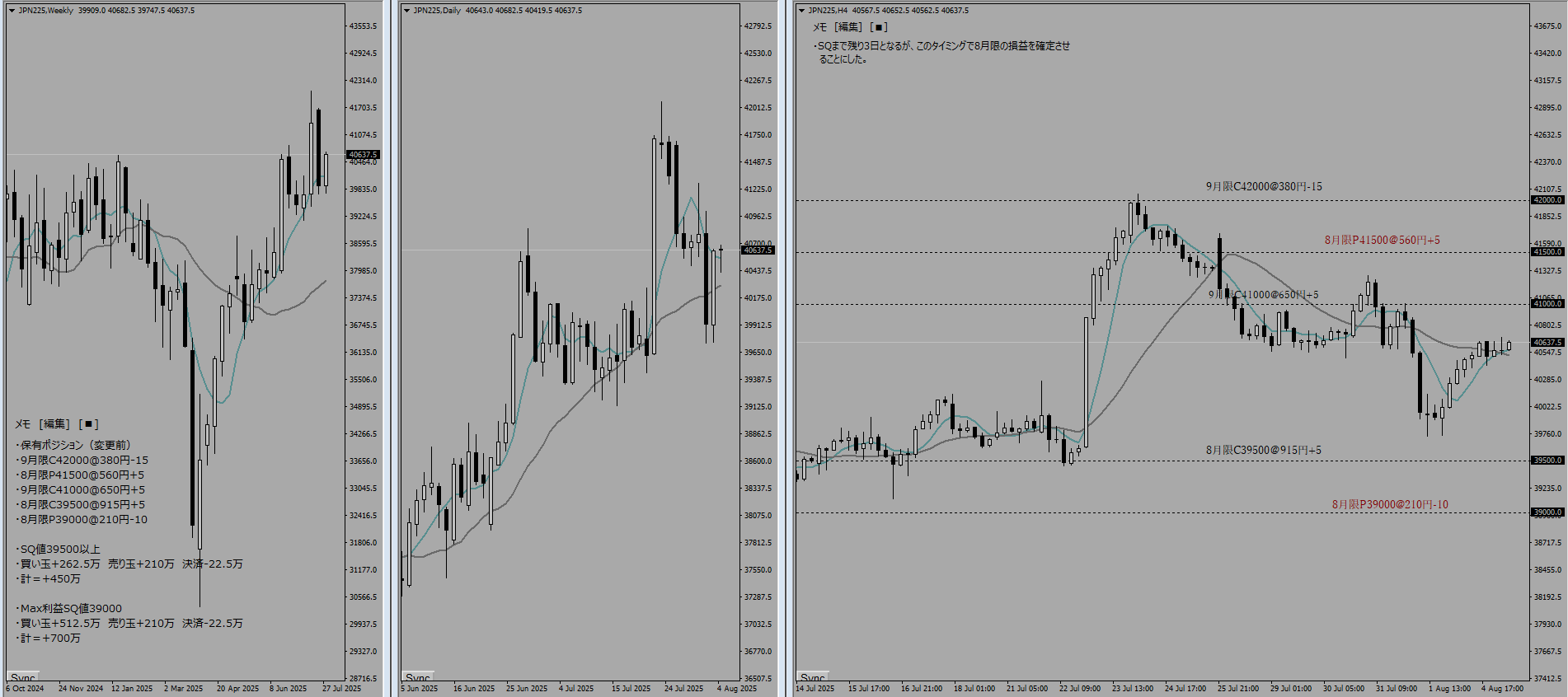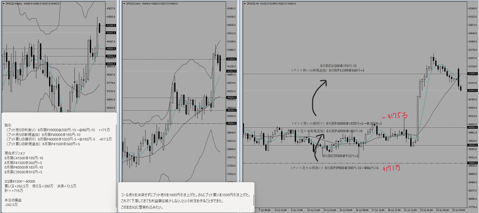 8月限C41500@195円-15→@240円-5 -22.5万 ※1/3だけ損切り