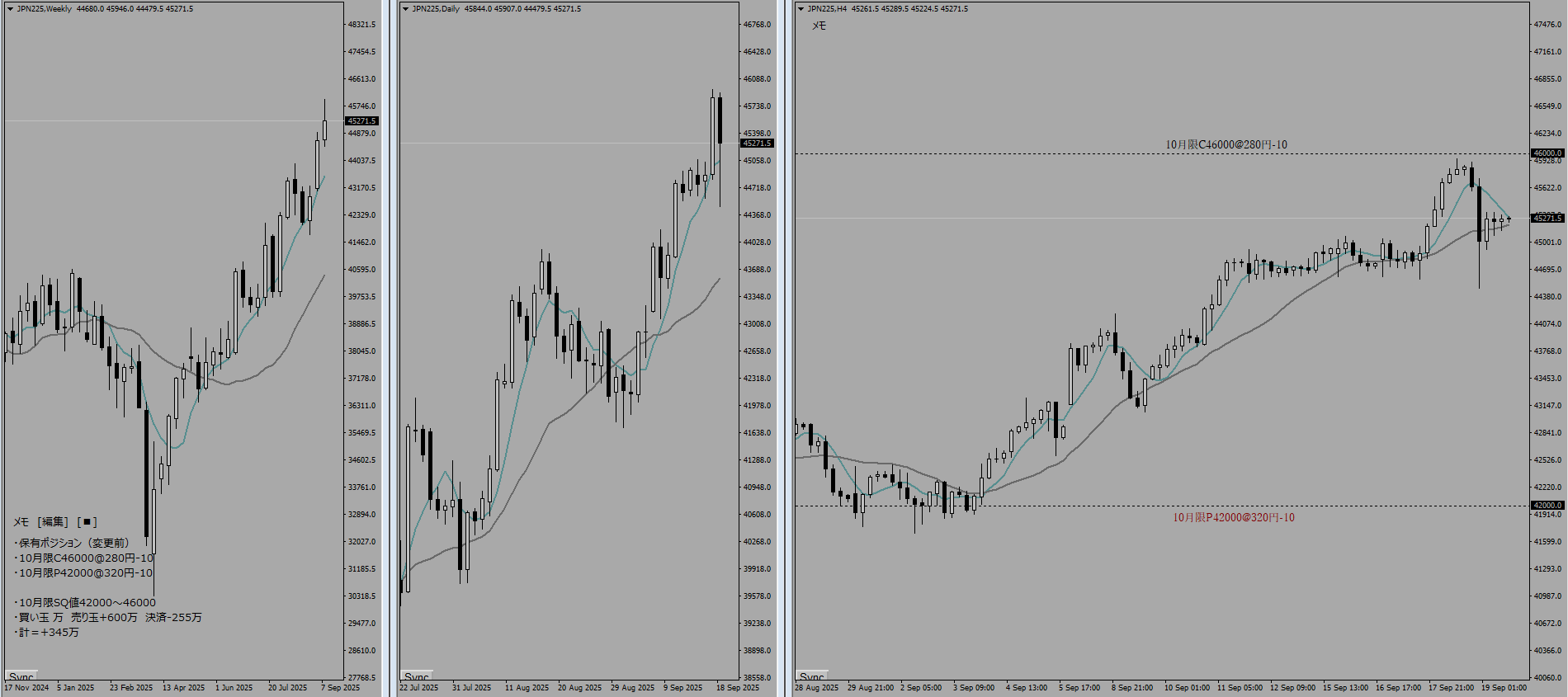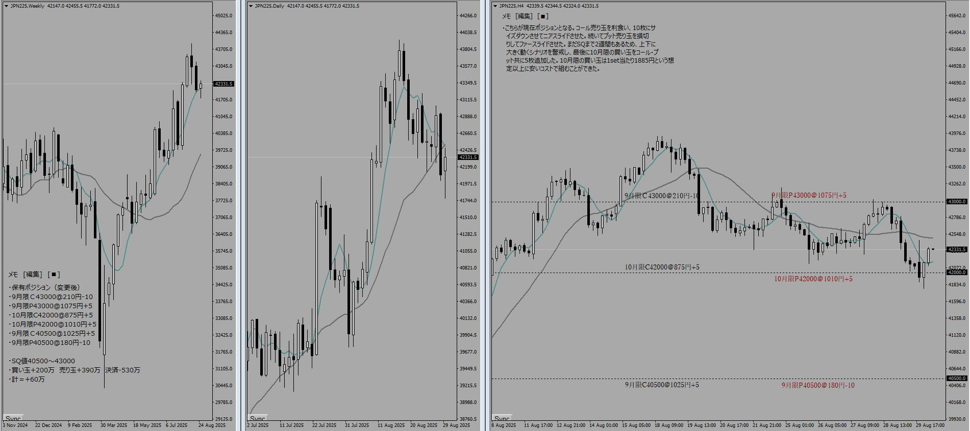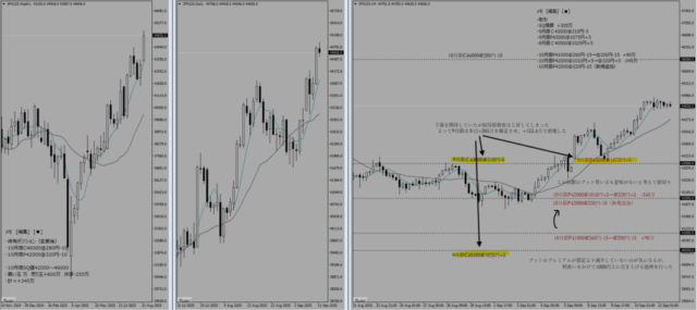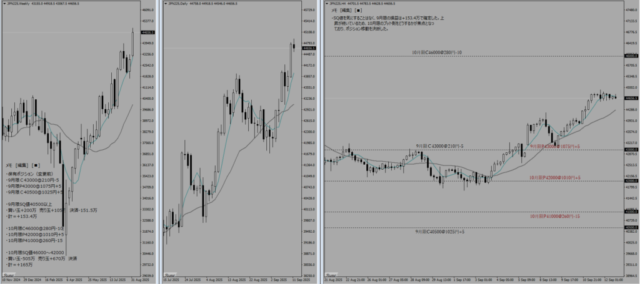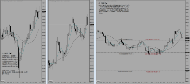 SQまで残り3日である。週末に石破首相が辞任するというビッグニュースによって月曜日から窓を開けて上昇でスタートしていた。両サイド共に1:1で組んでいるためノーリスクではあるのだが、このタイミングで9月限の利益を固め(更にリスクをとって利益を獲りにいくことを諦め)、10月限に移行する決断を下した。