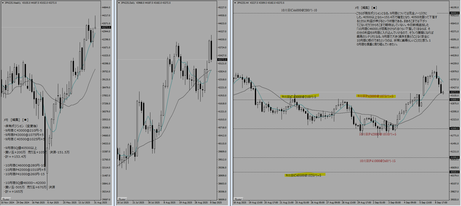 9月限については完全ノーリスクにした。SQが40500以上なら+153.5万で確定となり、40500を割って下落するとさらに利益が伸びるという状態である。まあそこまでは下がってこないだろうから期待はしていない。今日新規追加した「10月限C46000」も回転をかけられるぐらい下落してくるならば、そこ分の利益も9月限に入れ込んでいけるので、そういう展開になれば最高のシナリオとなる。9月限で大きく損失を食らうことなく安全に10月限に移行できたというのは非常に素晴らしいことだと思う。10月限も慎重に取り組んでいきたい。