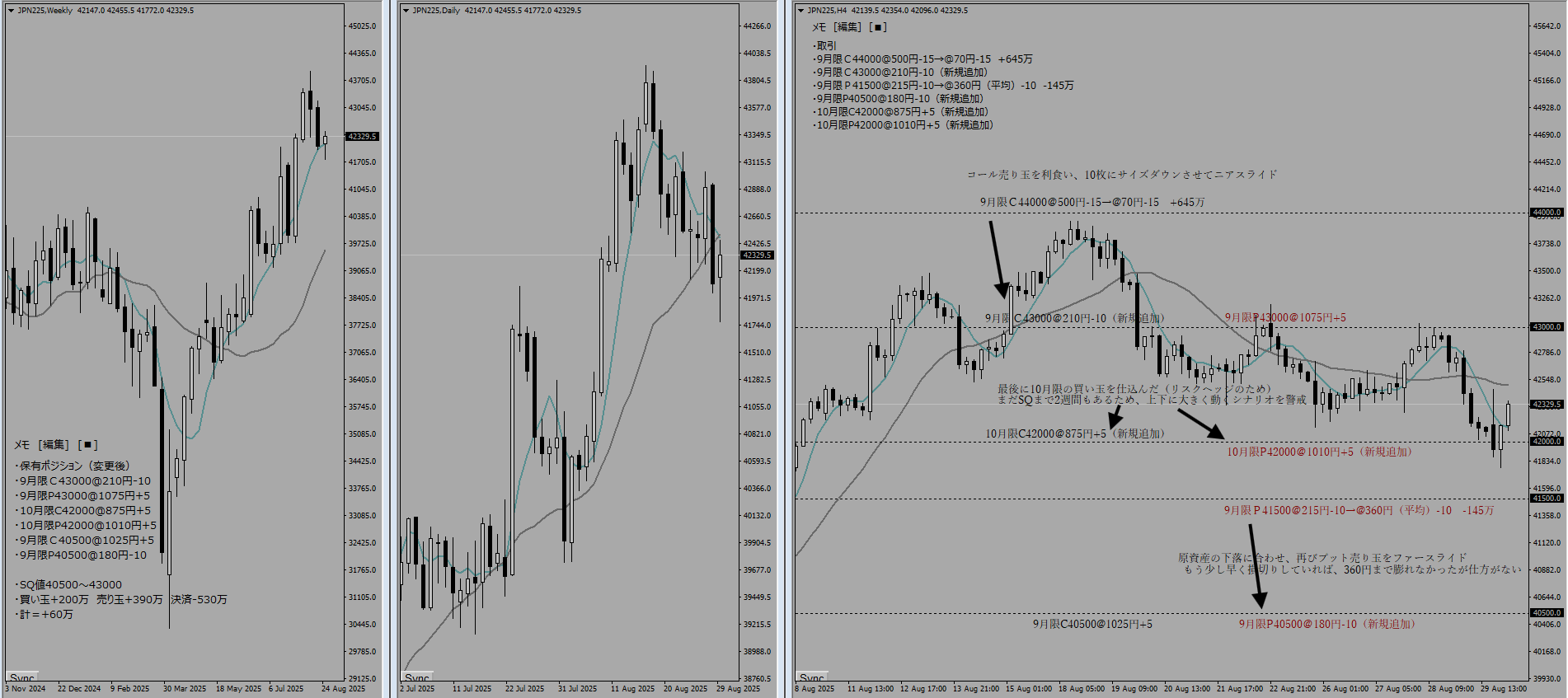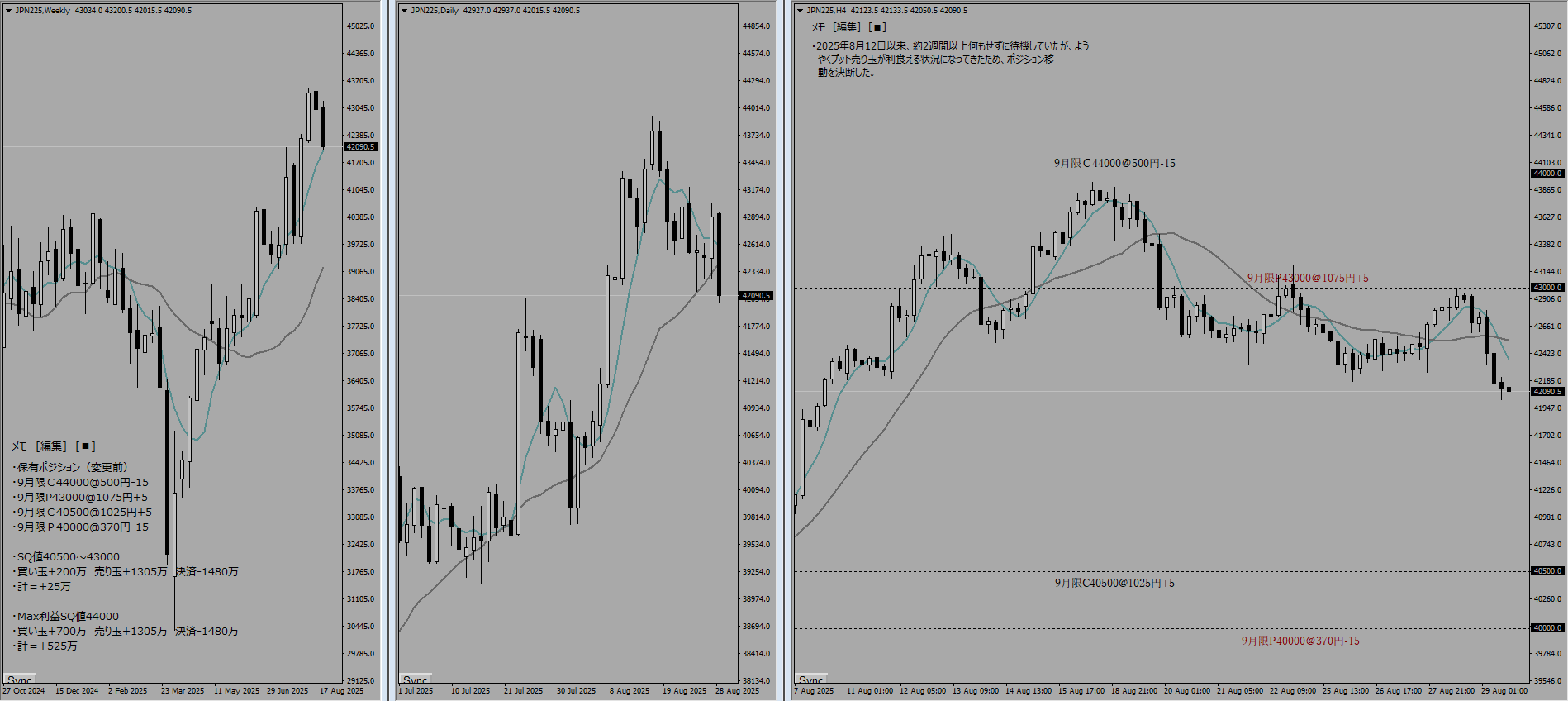 2025年8月12日以来、約2週間以上何もせずに待機していたが、ようやくプット売り玉が利食える状況になってきたためポジション移動を決断した。「どの権利行使価格に引き上げるか」「サイズをどうするのか」という2点がポイントであった。というのも、プット売り玉がコール買い玉よりも内側に入り込んでしまうためである。42000円も考えたが、流石にリスクが大きすぎるため41500円、10枚にサイズダウンさせることにした。今回のポジション移動の意図は「利益額を増やし、利益になる価格帯を狭めた」ということ。約100万程度利益額が増えた形となるが、41500円以上でないとこの数字にならないことを意識しておく必要がある。