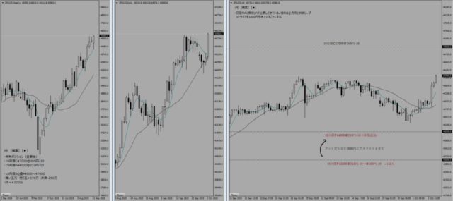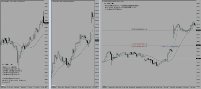 まずはコールサイドは損切りしてファースライドさせた。プットサイドはP44000の利食いをかけてから、さあどうするか?が焦点だった。ここまで急騰すると、1000円ぐらい一気に急落してきてもおかしくないが、それでも残り数営業日でのプレミアムの膨れを捨てがたいため、46500に期先の買い玉(急落してきたときのプットサイドのヘッジとしても役立つ)とセットで売り玉を再度組成した。プットサイドはニアスライドさせてさらに利益を積み重ねるべく攻めのポジション移動となる。さらに最後の手段として12月限の先物を1/3だけ追加した。これはコールサイドのヘッジポジションとなる。「1/3を先物でカバーし、1/3をオプションの引き上げでカバーし、1/3は放置」という戦略である。