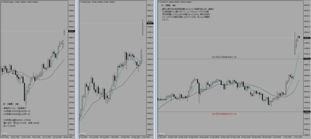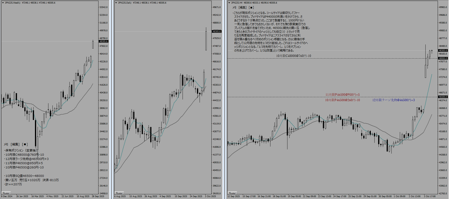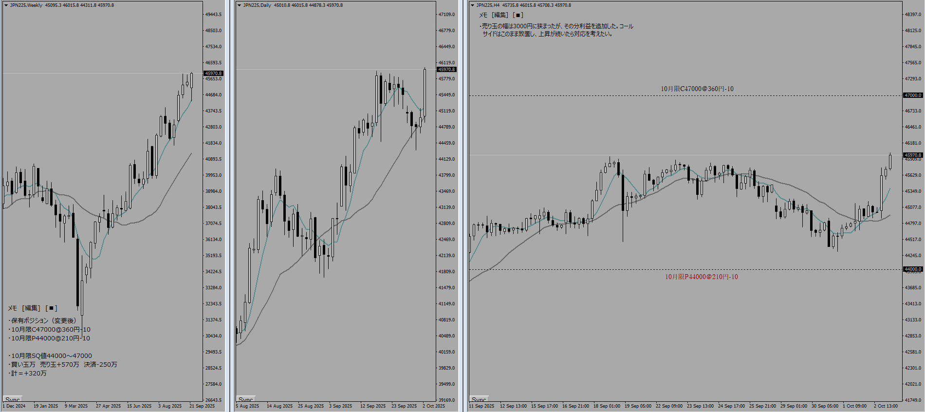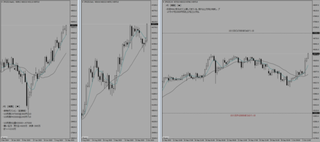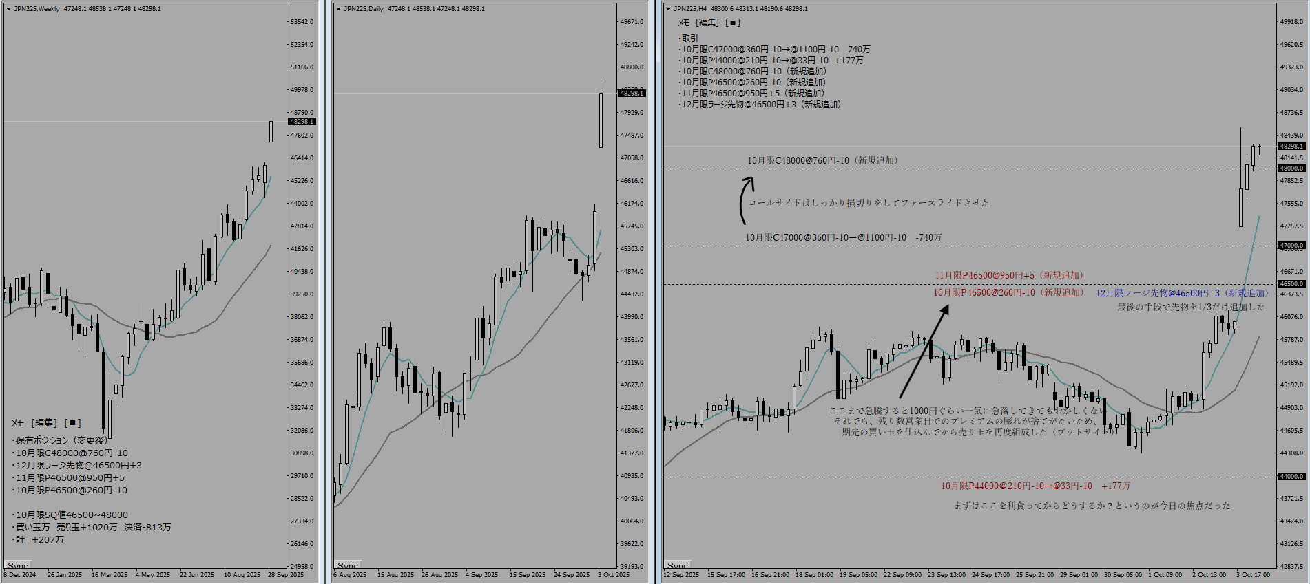 週末に高市氏が自民党総裁になったことで株高円安となり、週明けから窓を開けて上昇でスタート。ニュートラルファーアウトでの裸売りを放置していたことは大失態となってしまった。現状のままだとコールサイドの損失が膨れ上がっていくため、ポジション移動を決断した。